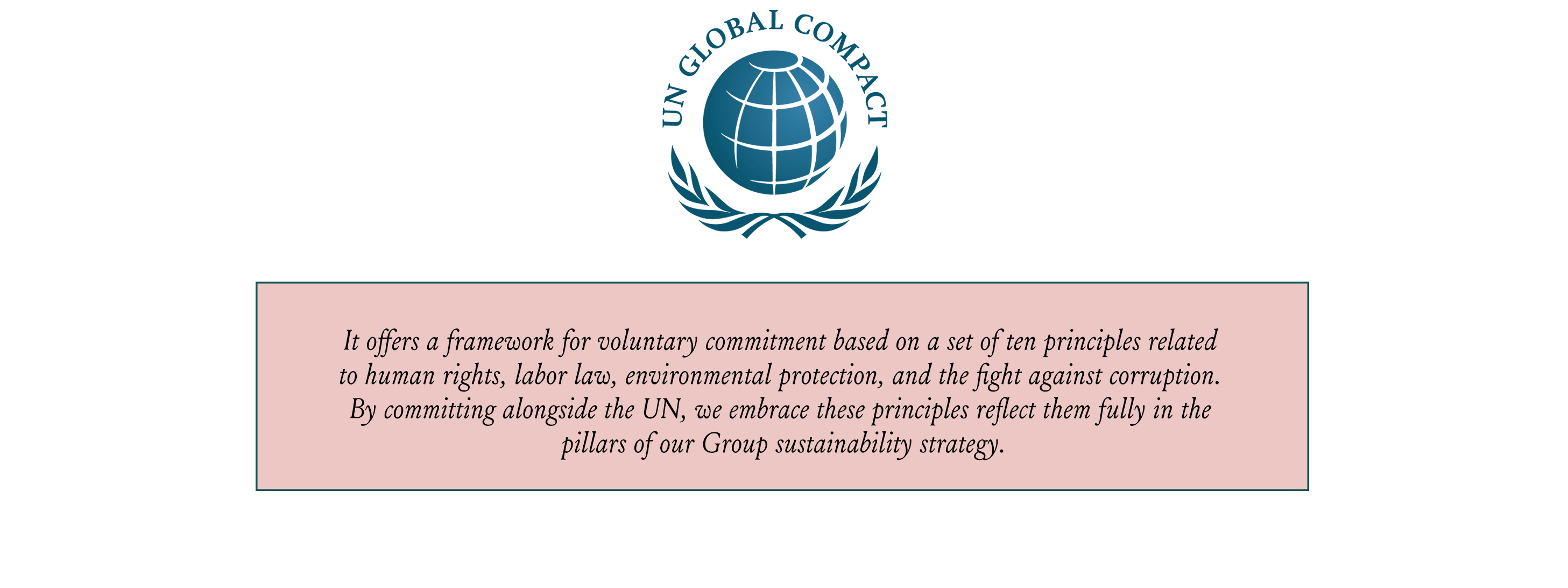 The United Nations Global Compact offers a framework of voluntary commitment based on a set of ten principles related to human rights, labor law, environmental protection, and the fight against corruption. By committing alongside the UN, we embrace these principles reflect them fully in the pillars of our Group sustainability strategy.